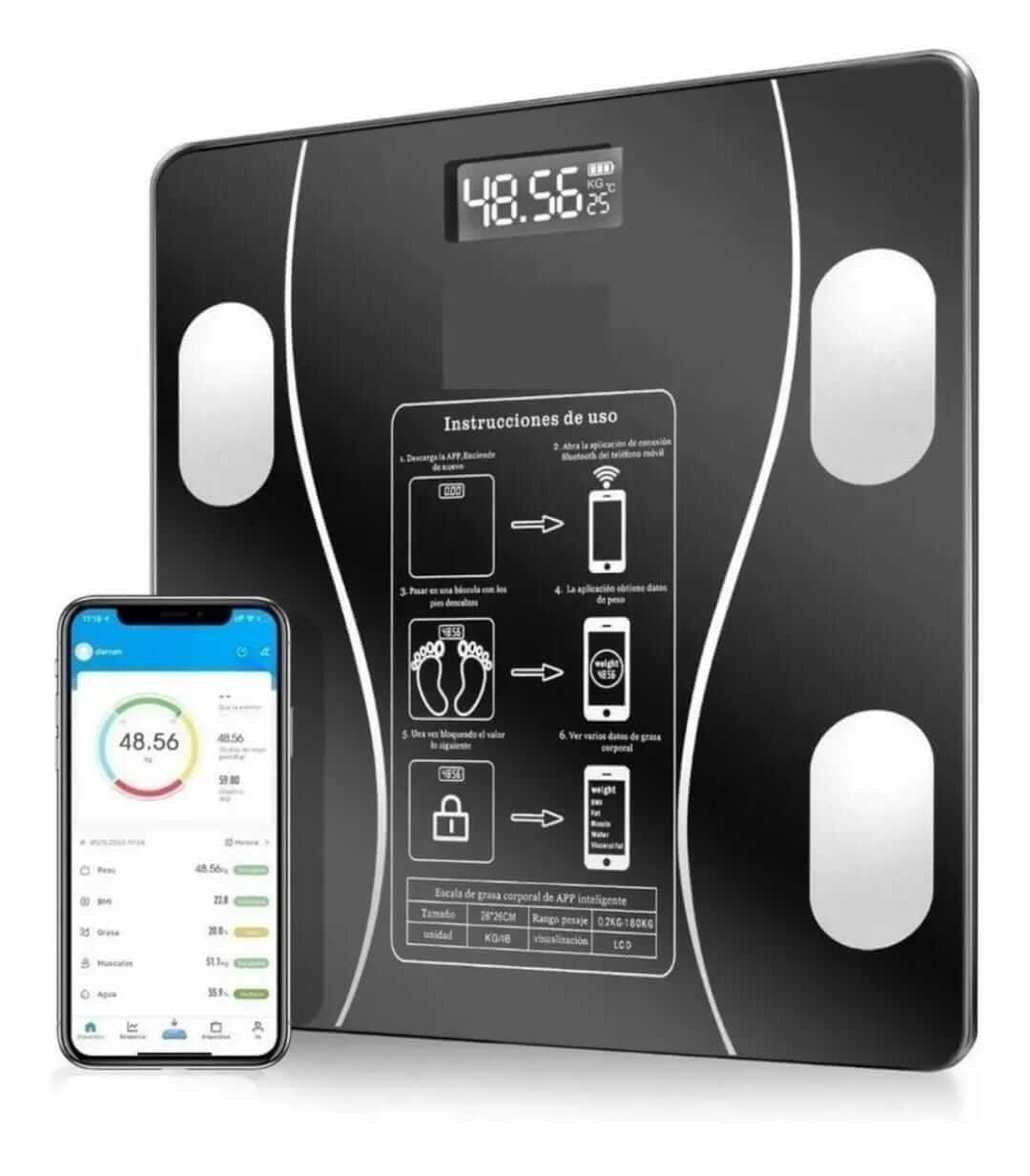 Que no falte en tu baño o hogar esta fabulosa Pesa Digital y medidor de Grasa Corporal Para Baño, Smart Bluetooth Dblue DBG1098 Realiza las siguiente mediciones, con el Software Scale Up Peso Corporal, IMC Porcentaje de grasa Masa Muscular, Porcentaje de Agua Corporal Porcentaje de Musculo Esquelético Masa, IMB Masa de Grasa Peso ideal Frecuencia cardiaca