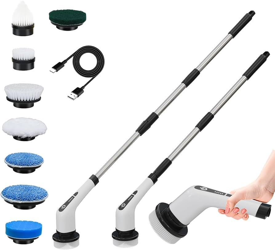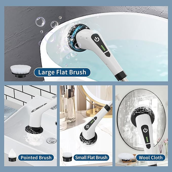 Limpiador eléctrico de alta potencia: este limpiador giratorio eléctrico inalámbrico fue diseñado intencionalmente para un uso versátil en toda tu casa. Cepillo limpiador eléctrico, alimentado por una batería de gran capacidad de 2500 mAh, par grande. Potente potencia de dos velocidades de rotación para tu elección: 300 RPM / 400 RPM. Cuando se usa con un agente de limpieza, puede limpiar rápidamente las manchas difíciles y hacer que el piso de baldosas se vea nuevo. Carga rápida tipo C y pantalla de nivel de batería: gracias a la última tecnología de carga rápida USB-C y la función de visualización de nivel de batería, nunca tendrás que preocuparte por quedarte sin energía. La batería avanzada de 2500 mAh ofrece hasta 90 minutos de limpieza en toda la casa con solo 3 horas de carga. Ajustable de 12 a 54 pulgadas: el mango del cepillo de limpieza de ducha con mango largo tiene un diseño de tres secciones. La longitud se ajusta fácilmente fijando y separando el mango telescópico, y la longitud del depurador eléctrico giratorio se puede ajustar de 12 pulgadas a 54 pulgadas. Es ideal para limpiar áreas de difícil acceso, el limpiador de baño con mango largo libera a las amas de casa de las engorrosas tareas domésticas, no más doblarse y arrodillarse para limpiar, protege tu espalda y rodillas. El cepillo de limpieza eléctrico incluye 7 cepillos de limpieza reemplazables para varios escenarios, puedes elegir diferentes especificaciones de cabezales de cepillo de acuerdo con la situación real. Este limpiador eléctrico de baño es la herramienta ideal para entrar en las grietas de tu baño.