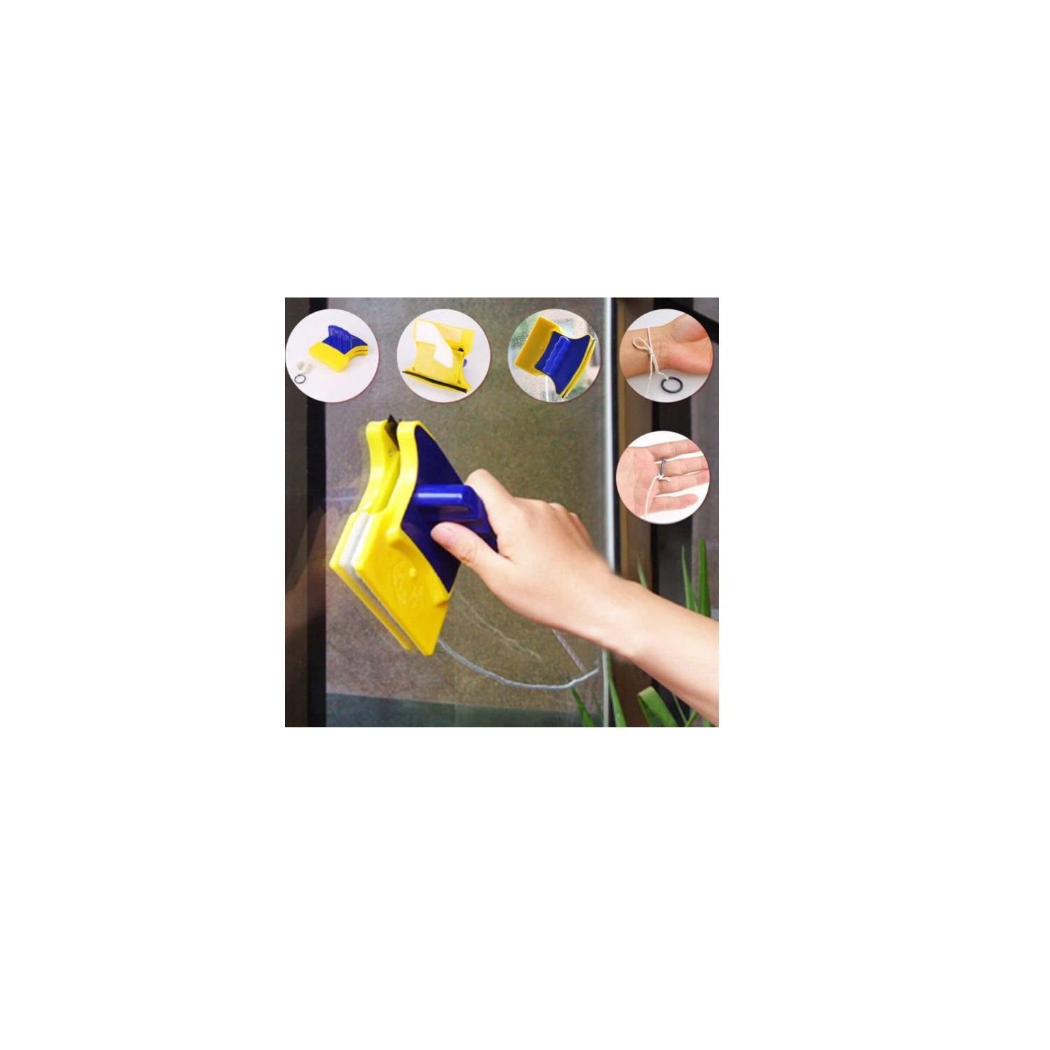 - El cepillo limpiador Imantado Magnético traer una esponja para limpiar (jabón), una pequeña haragán para secar los líquidos (agua) y Una fuerte Imán Magnético que lo mantiene unido ambos cepillo limpiador en el Vidrio, pegado fuertemente al vidrios, lo cual Limpiando ambos lado de vidrios de ventana o los vidrios de Vitrina exhibido de su Negocio (lado de afuera y adentro)