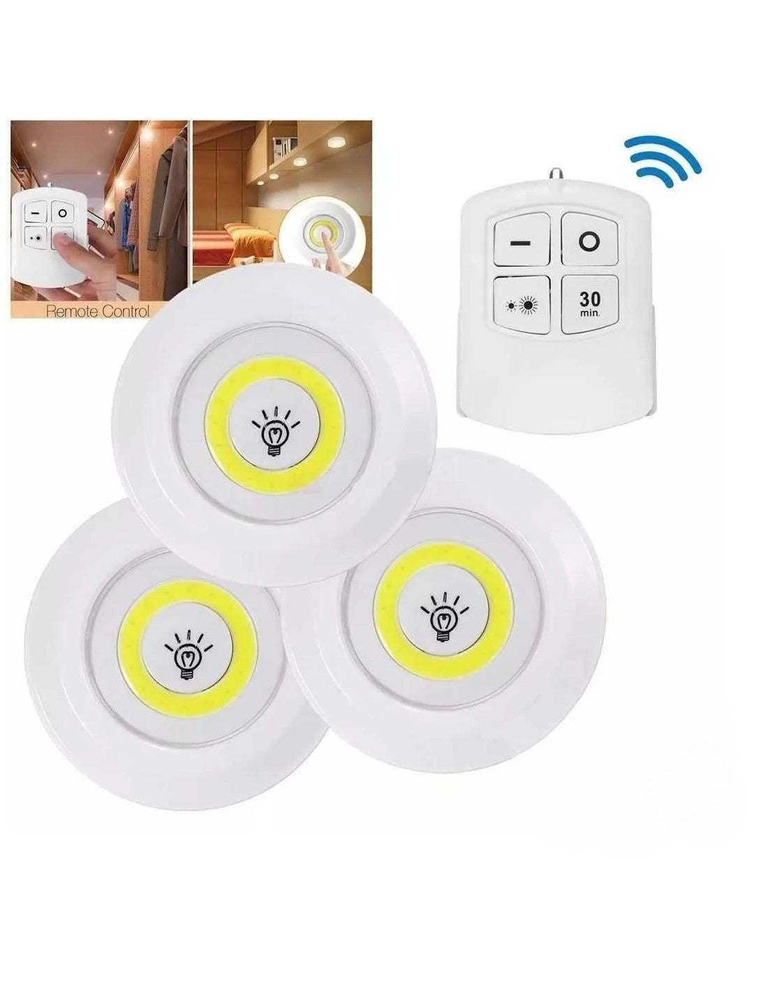 CÓMO FUNCIONA : Modo ON /OFF / Débil/Fuerte / 30 min Cada lámpara y el control remoto tienen cinta de doble cara para su uso en cualquier superficie. Distancia de control remoto 15M Utiliza 3 pilas AAA (Lámparas) y 2 pilas AAA (remoto) 3WTamaño luces: 89,5x89,5x23 mmTamaño control remoto: 80x62,3x20,5 mmApagado automático en 30 minCada luz y el control remoto incluye cinta doble contacto en la parte trasera, para fijarlo donde quiera