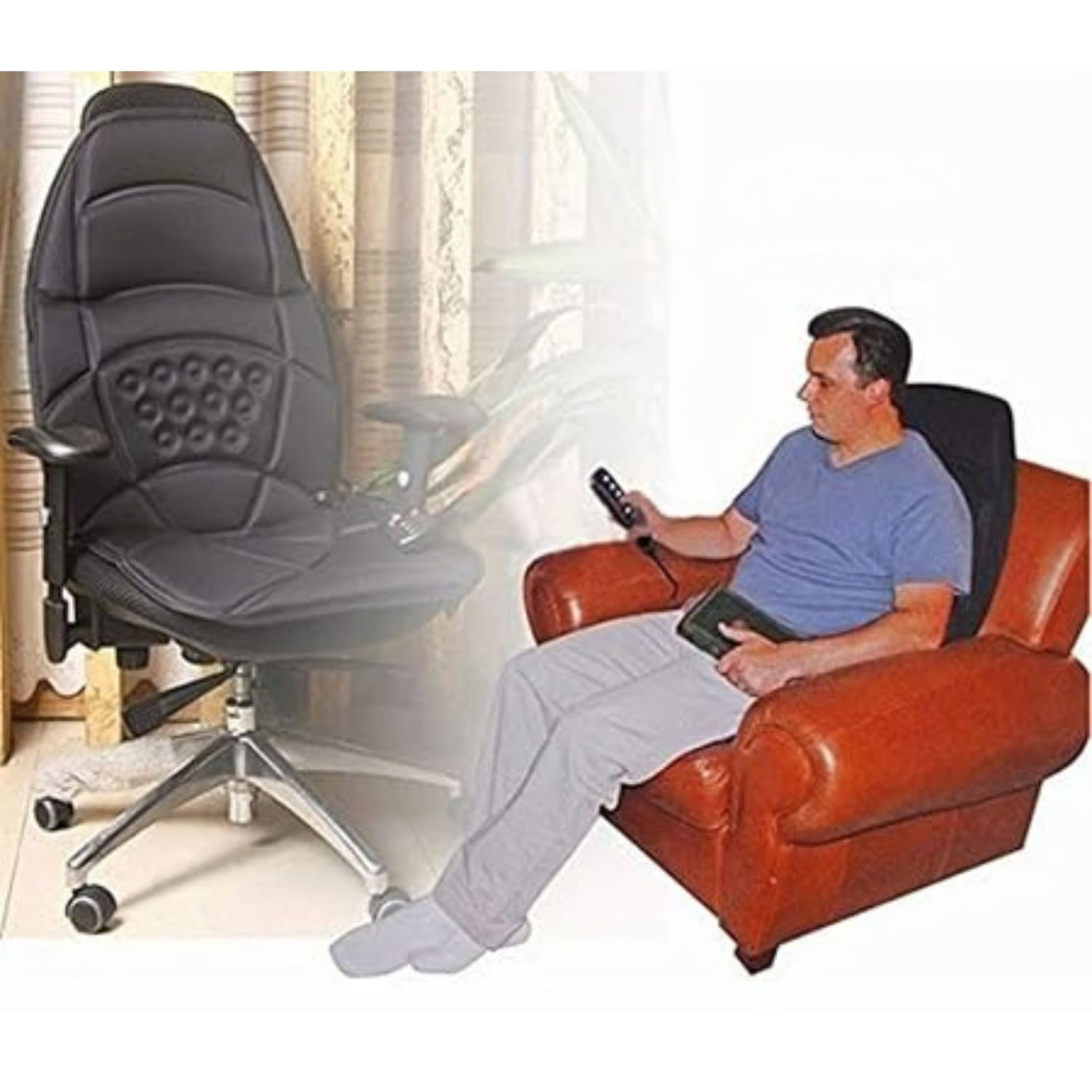 - Se alimenta con 12V y 220V, el transformador incluido. Cuenta con 2 zonas de masaje en los extremos y masaje por calor infrarrojo en el centro del masajeador. generando una cobertura total de la espalda. Facilmente adaptable a cualquier asiento o respaldo