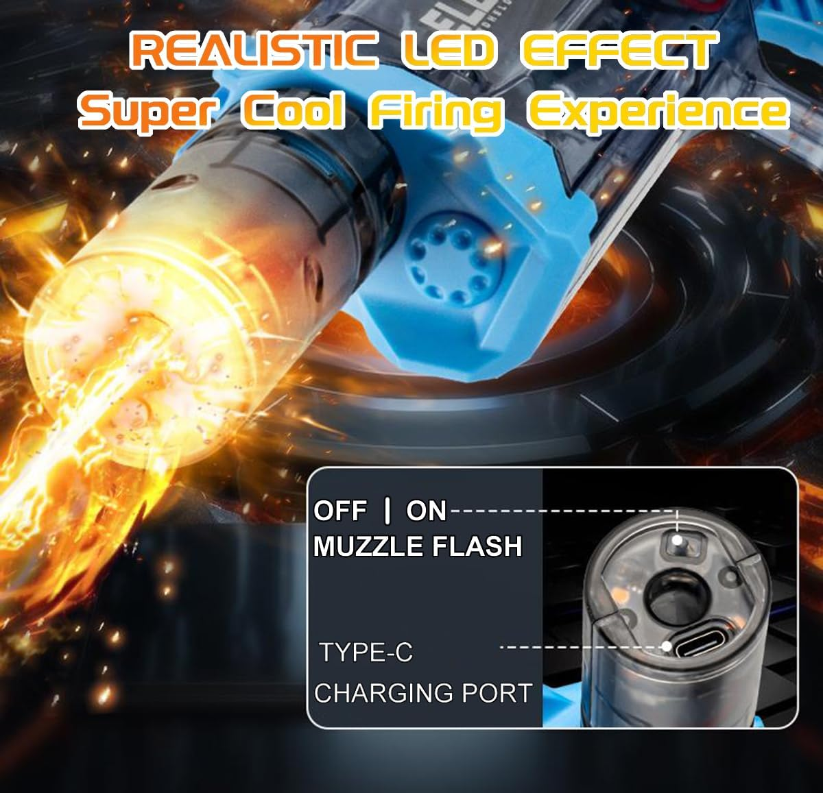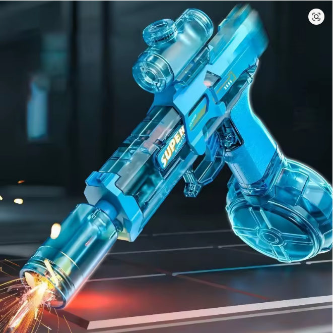 Diseño Futurista y Transparente: La pistola presenta un llamativo color azul eléctrico con secciones transparentes, permitiendo ver el mecanismo interno y el nivel de agua. Su look tipo rifle de asalto o blaster es increíblemente atractivo.
