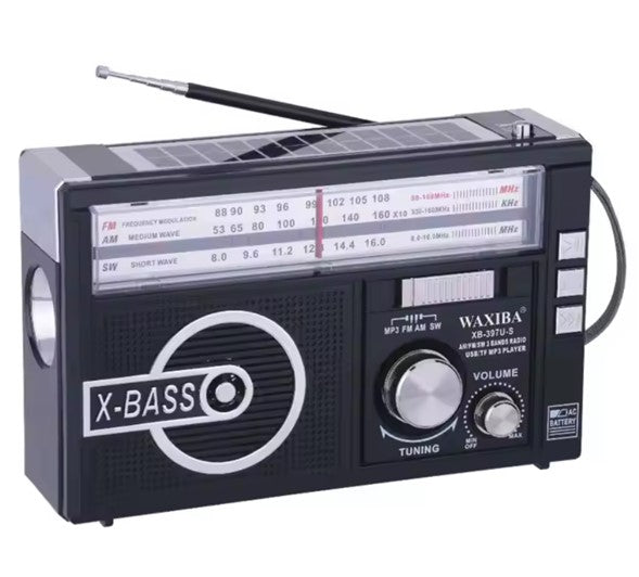 AM/FM/SW 3 bandaPortátil radio DE tamaño pequeño voz clara buena recepción de la señal ¡Fácil de usar en casa y al aire libre! Fácil acceso a el mundo exterior en el caso de los cortes de agua y los fracasos buen regalo para la buena deportes al aire libre socios también una gran herramienta para escuchando noticias programas y varios eventosEspecificaciónAM/FM/SW 3 banda mundo receptor USB/TF MP3 jugador Luz de la antorcha Alta sensibilidad de la antena Con PANEL SOLAR Construido-en el altavoz AC:110V-230V/60Hz-50Hz(AC solo para cargar) DC:3V(UM-1x2PCS) (Baterías no incluidas) Construido en 18650, LI-BATTERY