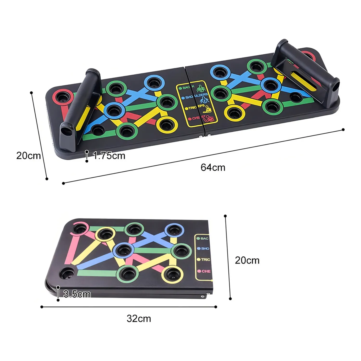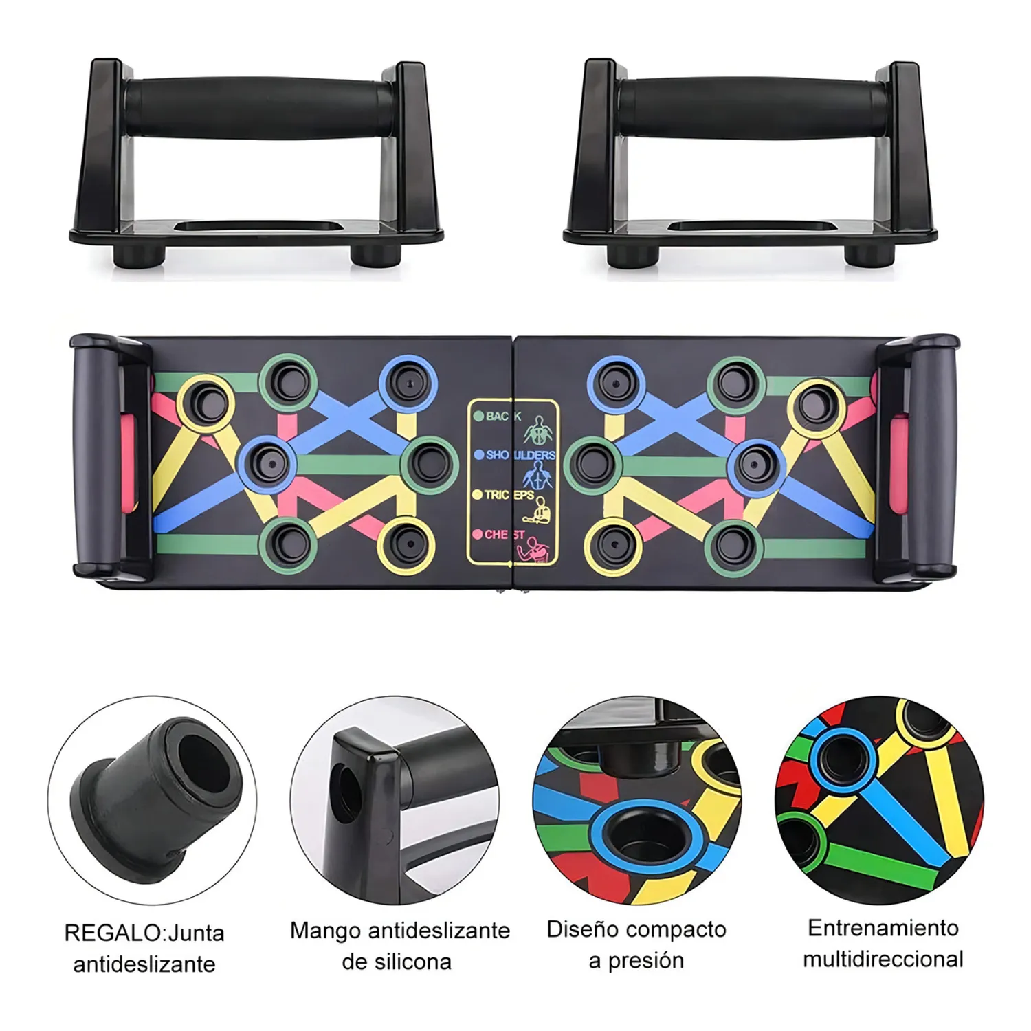 La Tabla Para Flexiones Ejercicio Multiuso Color Negro es un soporte de barra de empuje multiusos que puede satisfacer tus necesidades de ejercicio cambiando la posición del mango. De acuerdo con las indicaciones de color en la tabla de flexiones, tiene 11 métodos de ejercicio para ejercitar completamente los hombros, el pecho, brazo y la cintura.